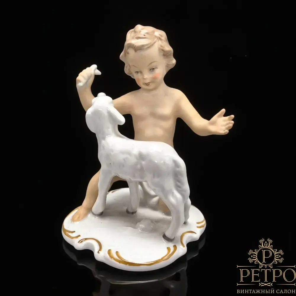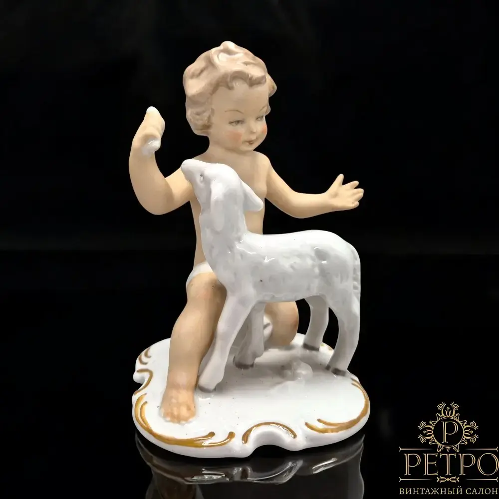 Винтажная фарфоровая статуэтка «Путти с ягнёнком» — Германия